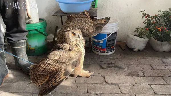 接警后,民警立即赶往现场。到场后,民警发现一只体型较大的雕鸮,已被王某从路中间转移至屋内,王某称其向雕鸮投喂2块肉,但它并未食用。民警在检查雕鸮身体状况时,发现其左侧翅膀受伤,随后民警将雕鸮带回所内。