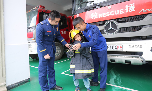 之后,还邀请他到消防队去参观,带他乘坐抢险救援车,为他穿上消防救援服,当了一回神气的“小小消防员”。“我长大以后要当一名军人,保家卫国!”王雨铭用洪亮的声音说。