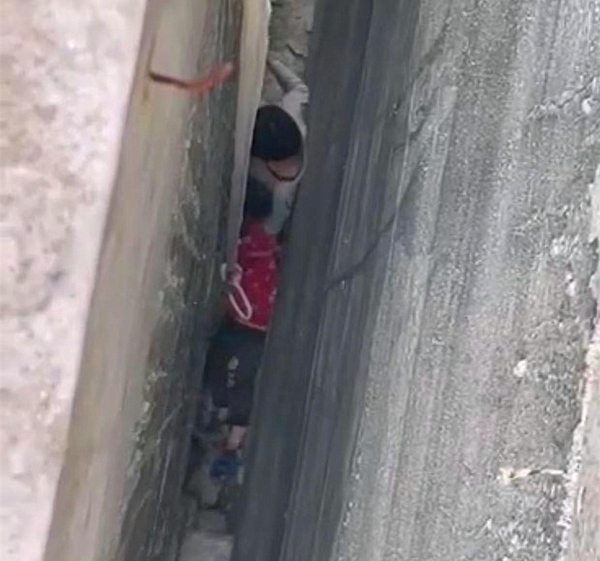 消防救援人员赶到现场后发现,孩子头朝外,脚朝内,侧身卡在墙缝中,不能动弹。