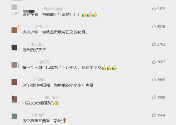 王雨铭年纪虽小,但表现出的勇敢和热心,赢得消防员和周围群众的一致点赞。