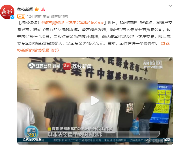 近日,扬州有银行报警称,某账户交易异常,触动了银行的反洗钱系统。警方调查发现,账户持有人朱某开有贸易公司,却并未经营任何项目,当即对资金流向展开溯源,确认该案件涉及地下钱庄交易,随后成立专案组抓获20名嫌疑人,涉案资金达46亿余元。目前,案件在进一步侦办中。
