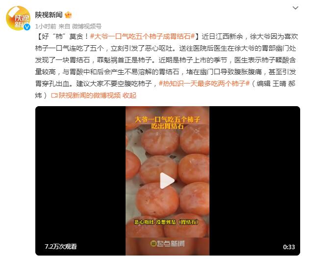 近日江西新余,徐大爷因为喜欢柿子一口气连吃了五个,立刻引发了恶心呕吐。送往医院后医生在徐大爷的胃部幽门处发现了一块胃结石,罪魁祸首正是柿子。近期是柿子上市的季节,医生表示柿子鞣酸含量较高,与胃酸中和后会产生不易溶解的胃结石,堵在幽门口导致腹胀腹痛,甚至引发胃穿孔出血。