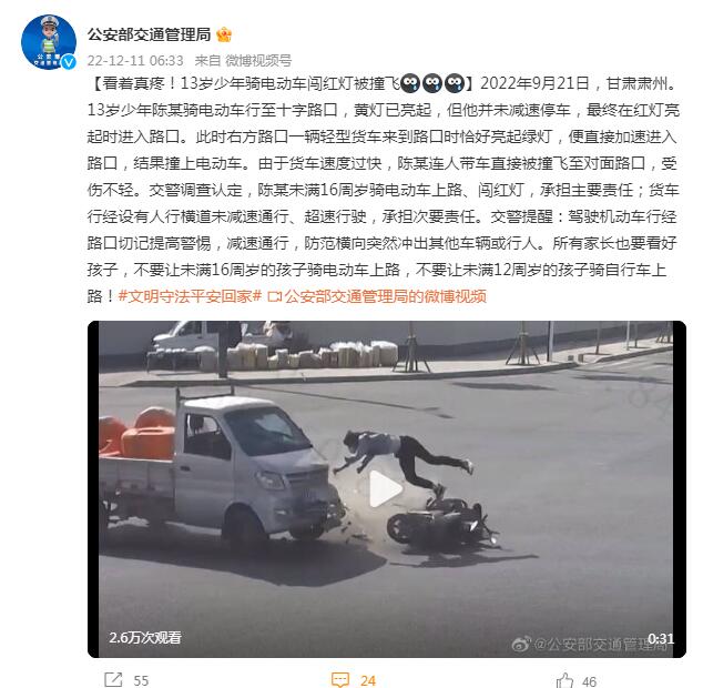 2022年9月21日,甘肃肃州。13岁少年陈某骑电动车行至十字路口,黄灯已亮起,但他并未减速停车,最终在红灯亮起时进入路口。此时右方路口一辆轻型货车来到路口时恰好亮起绿灯,便直接加速进入路口,结果撞上电动车。由于货车速度过快,陈某连人带车直接被撞飞至对面路口,受伤不轻。
