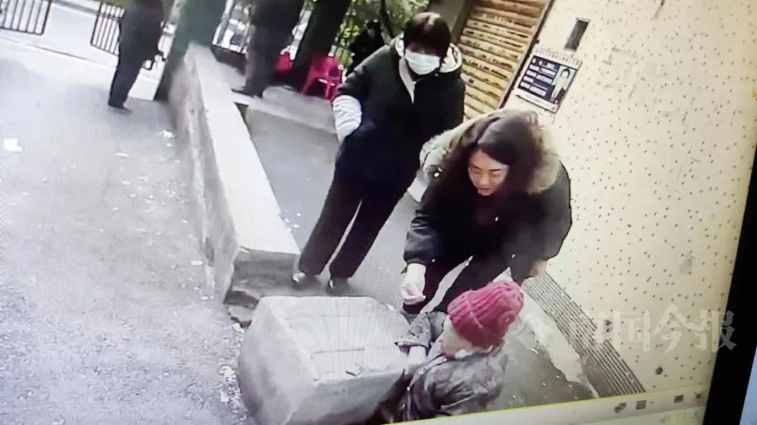 她便扶着老人靠在路边石墩上休息