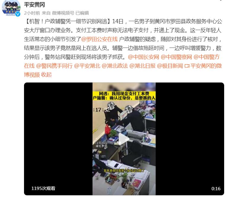 14日,一名男子到黄冈市罗田县政务服务中心公安大厅窗口办理业务。支付工本费时声称无法电子支付,并递上了现金。这一反年轻人生活常态的小细节引发了@罗田公安在线 户政辅警的疑虑,随即对其身份进行了核对,结果显示该男子竟然是网上在逃人员。辅警一边借故拖延时间,一边呼叫增援警力,数分钟后,警务站民警赶到现场将该男子抓获。