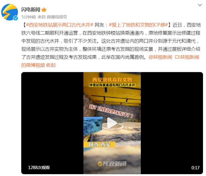 近日,西安地铁六号线二期顺利开通运营,在西安地铁钟楼站换乘通道内,原地修复展示出修建过程中发现的古代水井,吸引了不少关注。这处古井遗址内的两口井分别源于元代和清代,现场展示以古井实物为主体,整体环境还原考古发掘的现场实景,并通过展板详细介绍了古井遗迹发掘过程及考古发现成果,此举在国内尚属首例。(记者 李欢 丁亮 编辑 王晴 郝炜)