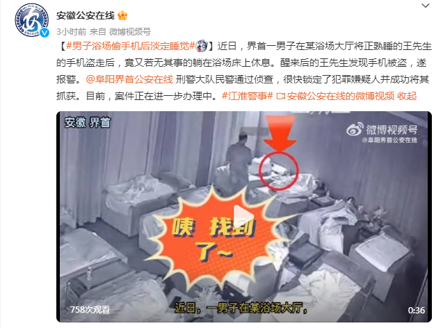 近日,界首一男子在某浴场大厅将正熟睡的王先生的手机盗走后,竟又若无其事的躺在浴场床上休息。醒来后的王先生发现手机被盗,遂报警。@阜阳界首公安在线 刑警大队民警通过侦查,很快锁定了犯罪嫌疑人并成功将其抓获。目前,案件正在进一步办理中。