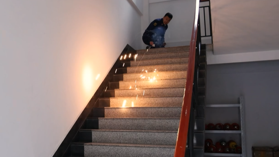 消防员将网红打火石加热,大约十秒后,网红打火石加热至红色球体状态。此时消防员用坚硬卡片物品代替手指将打火石从楼梯制高点弹出,现场火星四射,打火石落地后,在地面留下了明显的灼烧过的痕迹。