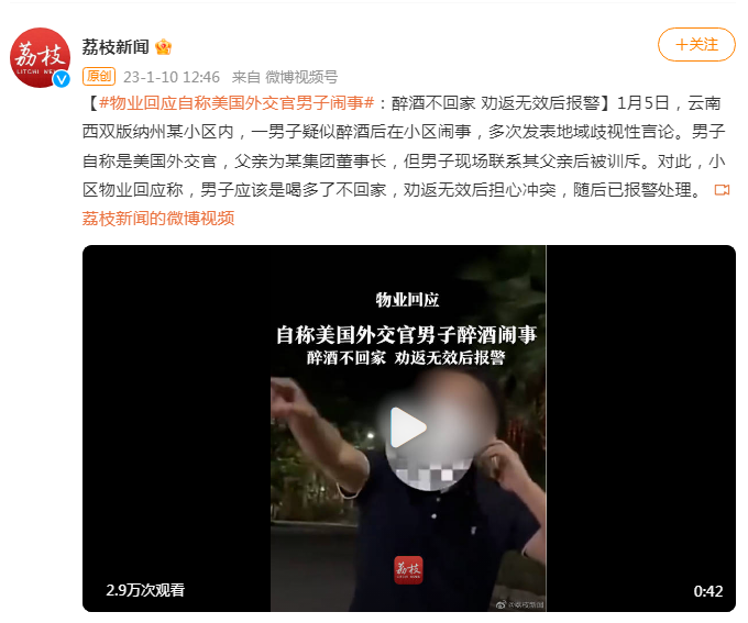 1月5日,云南西双版纳州某小区内,一男子疑似醉酒后在小区闹事,多次发表地域歧视性言论。男子自称是美国外交官,父亲为某集团董事长,但男子现场联系其父亲后被训斥。对此,小区物业回应称,男子应该是喝多了不回家,劝返无效后担心冲突,随后已报警处理。