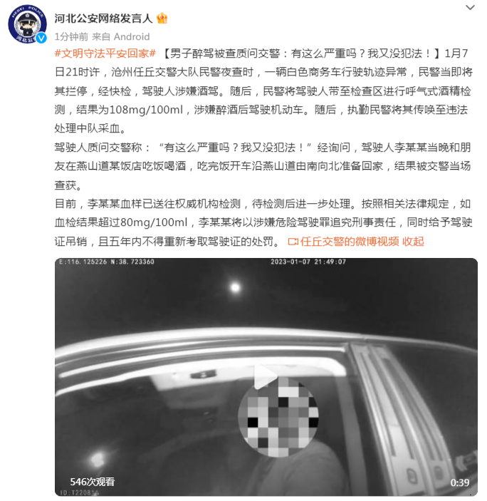 1月7日21时许,沧州任丘交警大队民警夜查时,一辆白色商务车行驶轨迹异常,民警当即将其拦停,经快检,驾驶人涉嫌酒驾。随后,民警将驾驶人带至检查区进行呼气式酒精检测,结果为108mg/100ml,涉嫌醉酒后驾驶机动车。随后,执勤民警将其传唤至违法处理中队采血。
