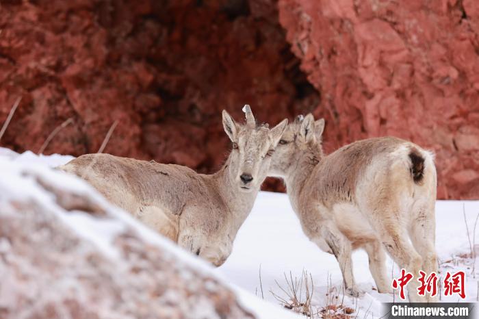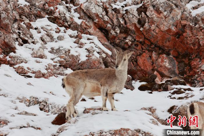 图为在雪中悠然自得的岩羊。 白日丁布江才 摄