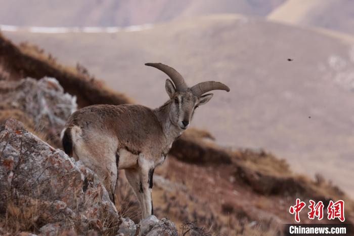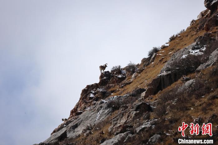 图为在山崖上站立的岩羊。 白日丁布江才 摄