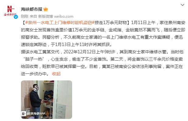 据该水电工黄某交代,2022年12月12日上午9时许,其到高女士家中维修水管。当时他“脑子一热”,心生贪念,偷走了不少金首饰。第二天,将金首饰以三千余元价格变卖给回收商,赃款早已被其挥霍一空。目前,黄某已被南安公安依法刑事拘留,案件正在进一步侦办中。