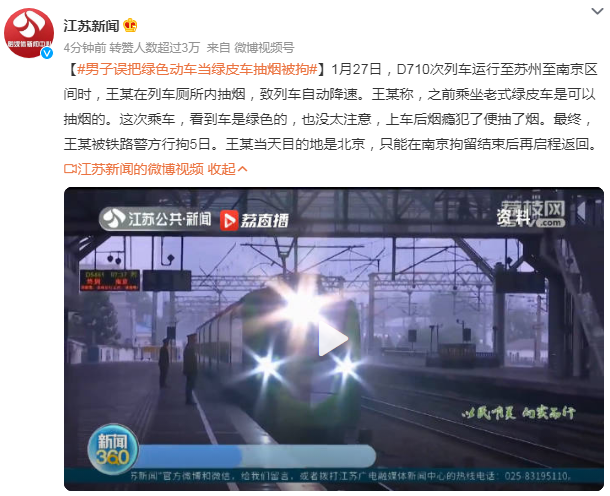 1月27日,D710次列车运行至苏州至南京区间时,王某在列车厕所内抽烟,致列车自动降速。王某称,之前乘坐老式绿皮车是可以抽烟的。这次乘车,看到车是绿色的,也没太注意,上车后烟瘾犯了便抽了烟。最终,王某被铁路警方行拘5日。王某当天目的地是北京,只能在南京拘留结束后再启程返回。