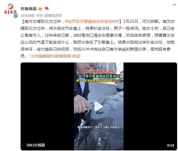 1月26日,河北邯郸。南方女婿到北方过年,将水倒在汽车盖上,结果秒变冰柱,男子一脸惊讶。施女士称,自己老公是南方人,过年来自己家,当时是他口渴去车里拿水喝,然后突发奇想,想看看水在这么低的气温下能变成什么,就把水倒在了引擎盖上。结果水刚倒出来秒变冰柱,他就很惊讶,连忙喊自己拍视频,然后兴冲冲地往自己南方亲戚的群里分享,感觉挺有意思。