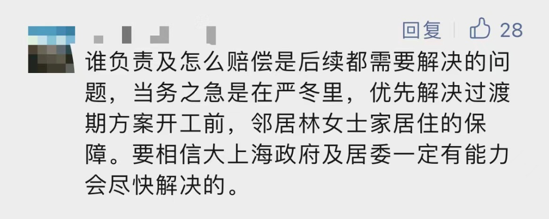 记者联系了属地街镇工作人员得知,楼下过世的这位老伯有一位远房表妹,她偶尔会来看望老人。老人过世后,表妹也在积极地跟居委对接善后事宜。接下来,他们会按照相应程序完成遗产继承后,对林女士家进行赔偿。至于林女士窗户的损失该由谁来维修,街道还会跟林女士进行进一步沟通。