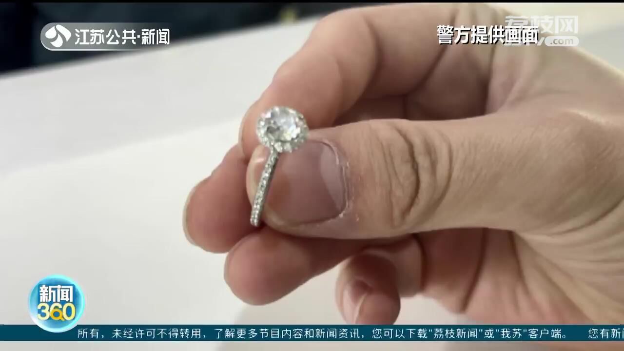 南京铁路公安处扬州站派出所民警朱丹说:“当时,我们在候车室座位上找寻的时候,发现一处有微亮的反光。然后一看,在座位的缝隙里发现了戒指。”