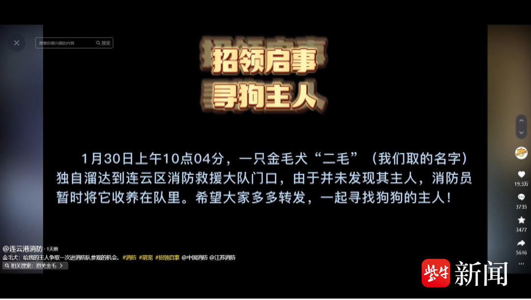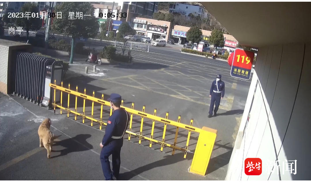 根据视频监控画面显示,30日上午10时04分,这只金毛犬“溜达”进了消防队。小金毛见到消防员后,不但没有丝毫胆怯,还一直对着消防员摇尾巴示好。由于并不知道金毛的主人是谁、家住哪里,消防员决定暂时收养它,给它买来了火腿肠、狗粮等食物,并临时搭建了小窝。同时,消防员还向社区人员和附近居民打听这只金毛的主人信息,有居民反映,之前确实见过这只金毛,但并不知道是谁家的。随后,消防员通过在“连云港消防”新媒体平台发布招领启事,来寻找金毛的主人。