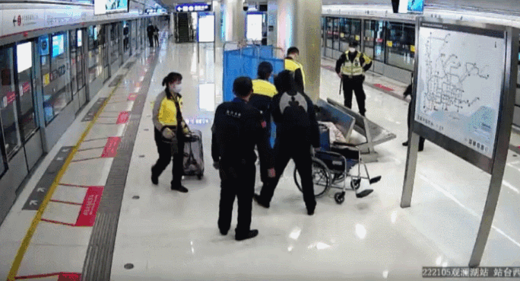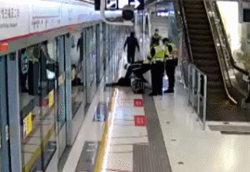 当列车即将行至观澜湖站,安全员发现乘客耷拉着身体,多次呼唤无法回应,安全员心提到了嗓子眼,快速唤来了其他车站职员,大家齐心协力将乘客抬至站台。