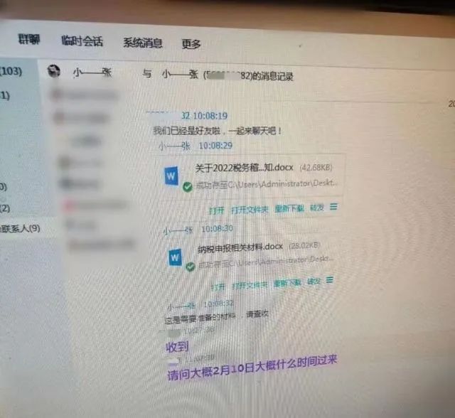 在群里,“税务局”发送加盖了公章的抽查文件,要求尽快准备营业执照、开户许可证、年度财务报税报表等相关材料,若不及时处理,将暂停税务登记证、发票使用。