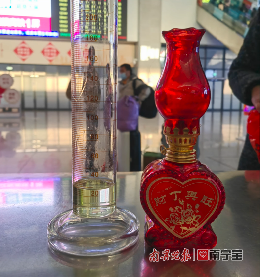 1月31日上午,一名中年女子在柳州火车站安检进站时,其随身携带的红桶引起了正在执勤派出所民警的注意。民警随即上前检查询问,发现其携带的红桶内放有一盏刻着“财丁兴旺”且正在燃烧的煤油灯。民警立即将煤油灯熄灭。经查,灯内有煤油25毫升。