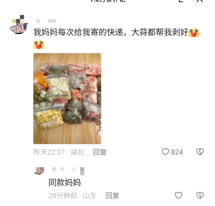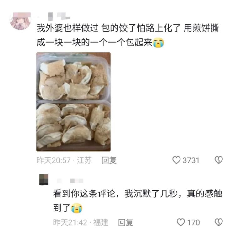 明女士记录了妈妈给自己的饺子,发布在社交平台,这条视频已经有近10万的点赞,引起了很多网友的共鸣,很多网友在评论区分享自己的经历,有人晒出外婆给自己寄的饺子说:“我外婆也样做过,包的饺子怕路上化了用煎饼撕成一块一块的一个一个包起来。”,还有网友评论说:我妈妈每次给我寄的快递,大蒜都帮我剥好。”还有网友被触动:“全世界只有妈妈会为你做这种事。”
