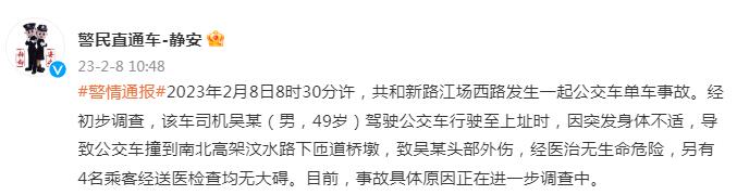 2023年2月8日8时30分许,共和新路江场西路发生一起公交车单车事故。经初步调查,该车司机吴某(男,49岁)驾驶公交车行驶至上址时,因突发身体不适,导致公交车撞到南北高架汶水路下匝道桥墩,致吴某头部外伤,经医治无生命危险,另有4名乘客经送医检查均无大碍。目前,事故具体原因正在进一步调查中。