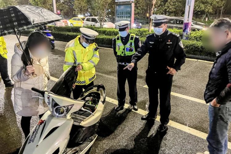2月5日晚,防城港市公安局交警支队港口大队在辖区内开展交通违法行为夜查整治行动过程中,执勤人员示意辅道内一辆电动摩托车停车接受检查。然而该车驾驶人不仅没有降低车速,反而试图加速冲卡!因当时路面湿滑,车辆突然提速导致车轮打滑后失控,驾乘人员与车辆接连倒地。