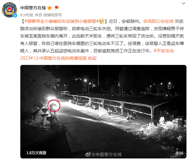 近日,安徽滁州。@凤阳公安在线 洪武路派出所接到群众报警称,自家电动三轮车失窃。民警通过调查追踪,发现嫌疑男子将车骑至某医院车棚内离开,此后数天未取车,便将三轮车带回了派出所。没想到隔天就有人报警,称自己停在医院车棚里的三轮电动车不见了。经调查,该报警人正是盗车嫌疑人,其共承认五起盗窃电动车案件,目前追赃挽损工作正在进行中。