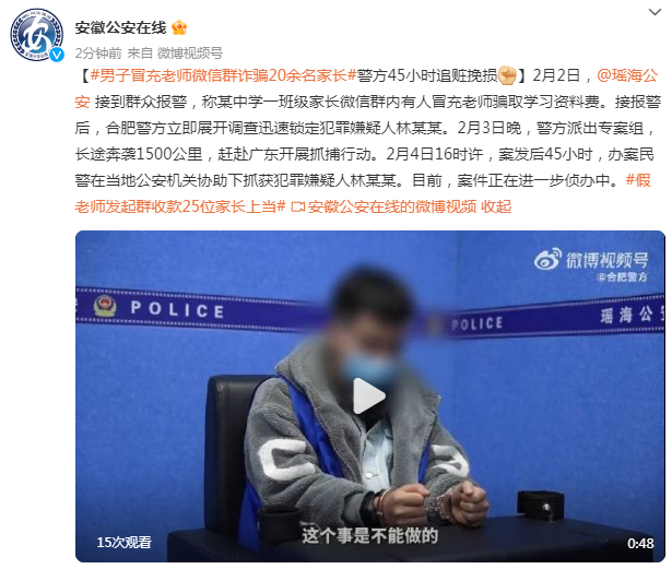 2月2日,@瑶海公安 接到群众报警,称某中学一班级家长微信群内有人冒充老师骗取学习资料费。接报警后,合肥警方立即展开调查迅速锁定犯罪嫌疑人林某某。2月3日晚,警方派出专案组,长途奔袭1500公里,赶赴广东开展抓捕行动。2月4日16时许,案发后45小时,办案民警在当地公安机关协助下抓获犯罪嫌疑人林某某。目前,案件正在进一步侦办中。