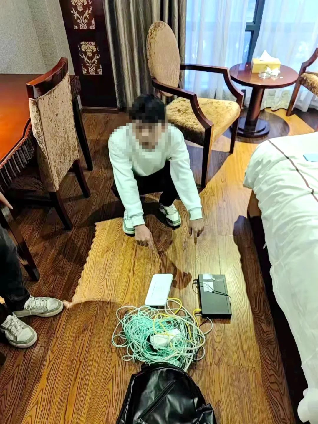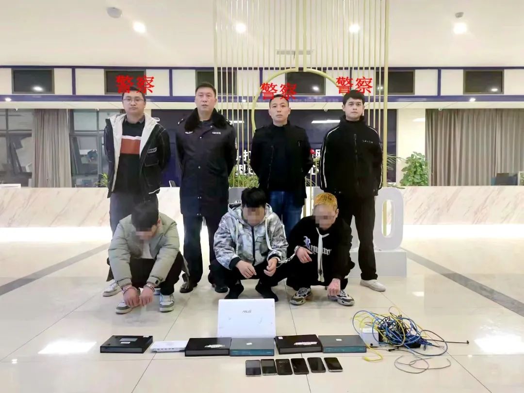 “嫌疑人已全部聚齐,可以行动!”秘密蹲守两天后,抓捕组民警兵分两路,一举将藏匿在两家宾馆的9名涉案人员全部抓获,并当场缴获GOIP设备5套、作案手机6部,以及笔记本电脑等其他作案工具若干。
