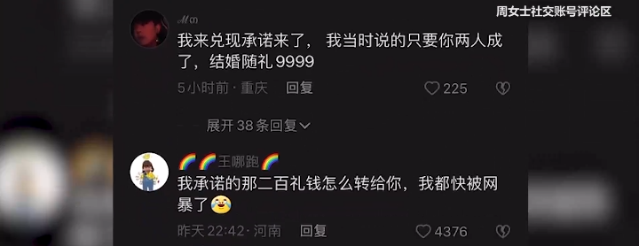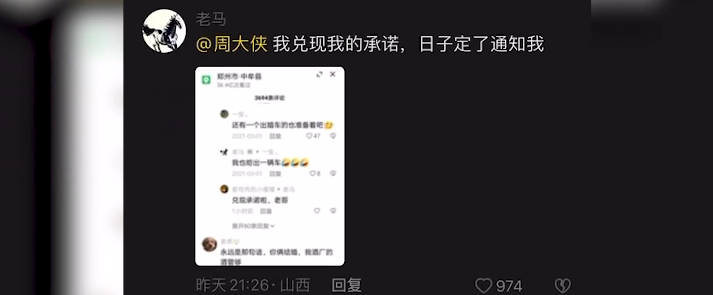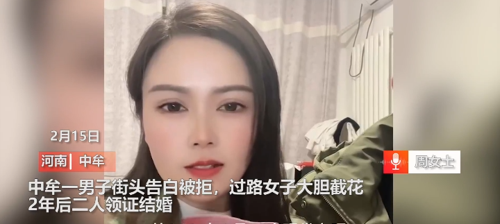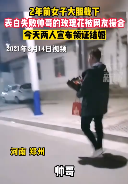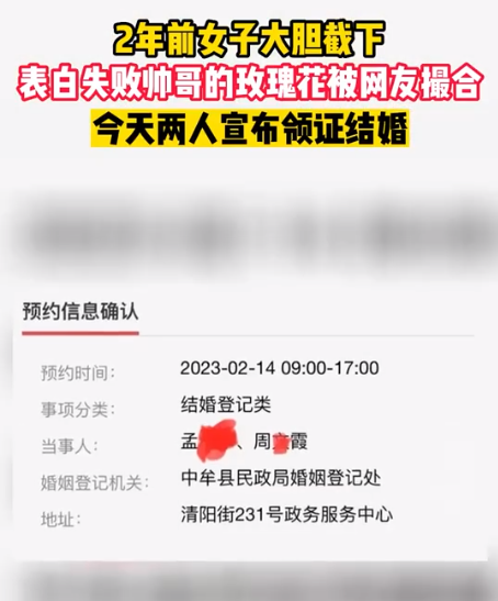 大河报·豫视频此前报道,2021年2月14日,郑州周女士路遇一男子表白失败,便喊话要鲜花,男子将鲜花赠与周女士。周女士将这段经过发到社交平台,引发网友关注。在网友的接力下,周女士联系上了视频中的男子孟先生,二人相处一段时间后确定恋人关系。2023年 2月14日,中牟周女士在社交平台发声,称已和孟先生领证,将择日举办婚礼。 此事迎来圆满结局,惊动了此前留言的众多网友前来兑现“祝福”!