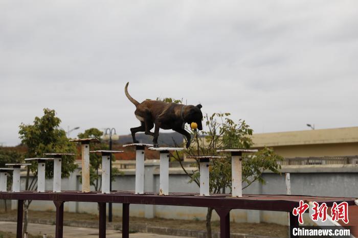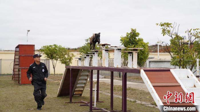 训导员带犬跨越障碍。 姚鹏鹏 摄