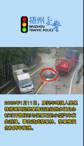 2023年1月11日14时许,摩托车驾驶人黎某林搭乘其姐黎某梅在途经梧州市长洲区S323倒水镇白办村对开路段时,与梁某石的小型汽车发生刮撞,事故造成黎某林、黎某梅受伤及两车受损。