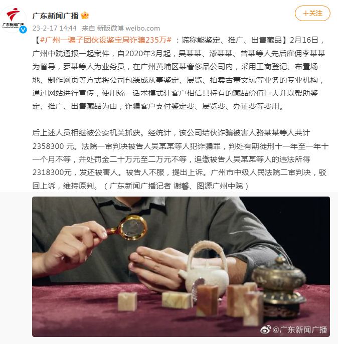 2月16日,广州中院通报一起案件,自2020年3月起,吴某某、漆某某、曾某等人先后雇佣李某某为督导,罗某等人为业务员,在广州黄埔区某奢侈品公司内,采用工商登记、布置场地、制作网页等方式将公司包装成从事鉴定、展览、拍卖古董文玩等业务的专业机构,通过网站进行宣传,使用统一话术模式让客户相信其持有的藏品价值巨大并以帮助鉴定、推广、出售藏品为由,诈骗客户支付鉴定费、展览费、办证费等费用。