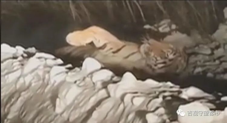 2022年12月末,在吉林汪清县,一男子开车路遇老虎,只见老虎躺在路边的雪地上休息,时不时地伸出爪子。