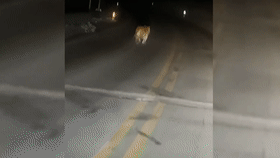 视频拍摄者打开车灯,放慢车速,跟在这只老虎的后面,为其照明。这只老虎一路小跑,终于安全离开。