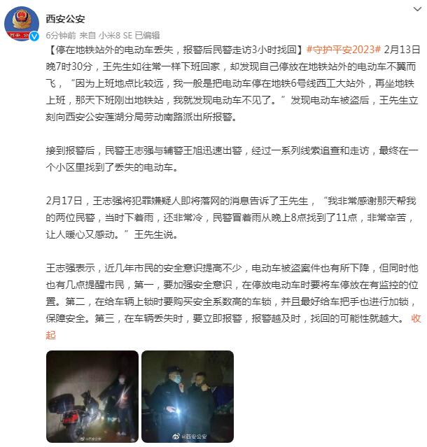 2月13日晚7时30分,王先生如往常一样下班回家,却发现自己停放在地铁站外的电动车不翼而飞,“因为上班地点比较远,我一般是把电动车停在地铁6号线西工大站外,再坐地铁上班,那天下班刚出地铁站,我就发现电动车不见了。”发现电动车被盗后,王先生立刻向西安公安莲湖分局劳动南路派出所报警。