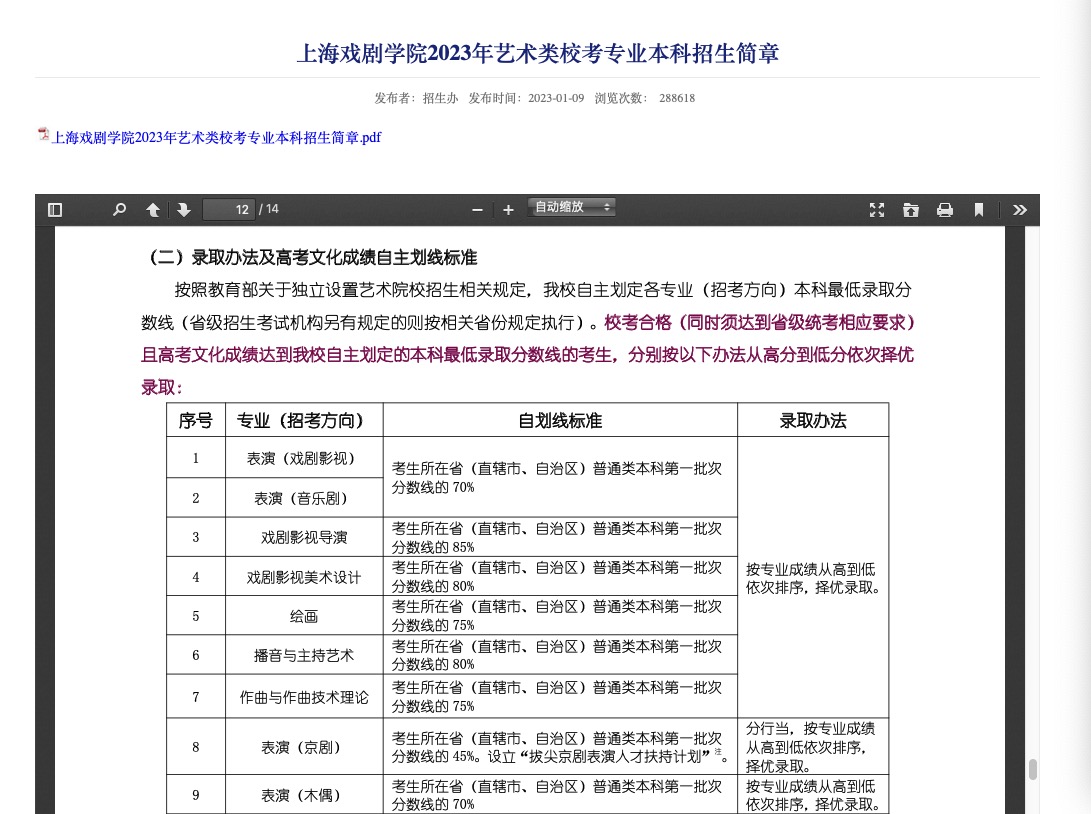 而参照上海戏剧学院2023年1月9日发布的《上海戏剧学院2023年艺术类校考专业本科招生简章》,2023年表演(戏剧影视)及表演(音乐剧)方向的专业,高考文化课要求为考生所在省(直辖市、自治区)普通类本科第一批次分数线的70%。不过,该要求相较而言的确高于往年,上戏招生网信息显示,2022年上戏艺考表演(戏剧影视)及表演(音乐剧)方向专业的高考文化课要求为不低于各省(直辖市、自治区)“一本线”的65%。