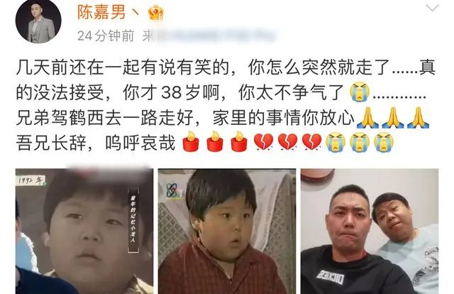 好友陈嘉男也证实了这一不幸的消息,他在朋友圈和微博先后发言,称“几天前还在一起有说有笑的,真的没法接受……”