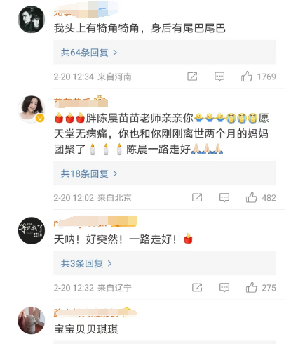 2月20日凌晨,演员苗苗(黄禾)在社交平台发文悼念,曾与她在《亲亲我老师》中合作、也是在《小龙人》里扮演贝贝的演员陈晨,于2023年2月18日因病在北京突然离世。