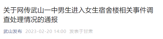 2月18日,网传武山一中男生进入女生宿舍楼相关事件发生后,县委、县政府高度重视,及时责成县公安局、县教育局、武山一中组成工作组,对该事件开展深入调查处置。现将调查处理情况通报如下:
