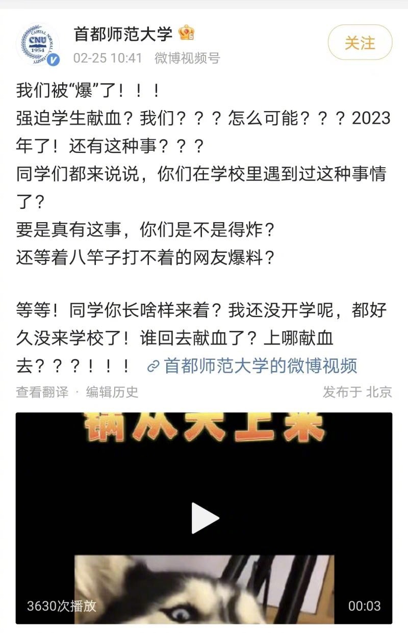 2月24日开始,网络上流传首都师范大学要求学生强制献血一事,不少网友对此半信半疑。25日上午,首都师范大学官方微博回应此事,进行公开辟谣。