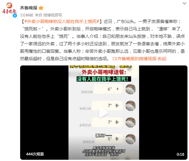 近日,广东汕头。一男子发语音催单称:“饿死啦~”。外卖小哥听到后,开启咆哮模式,表示自己马上就到,“漂移”来了、没有人能在他手上“饿死”。当事人介绍:自己和朋友来汕头旅游,对本地不熟,误点了一家很远的外卖,过了两个多小时还没送到,朋友就发了一条语音去催,结果外卖小哥用魔性的口音回复。当事人称:辛苦外卖小哥跑那么远,见面小哥也是乐呵呵的,虽然最后超时,但是自己没有点超时赔偿的选项。