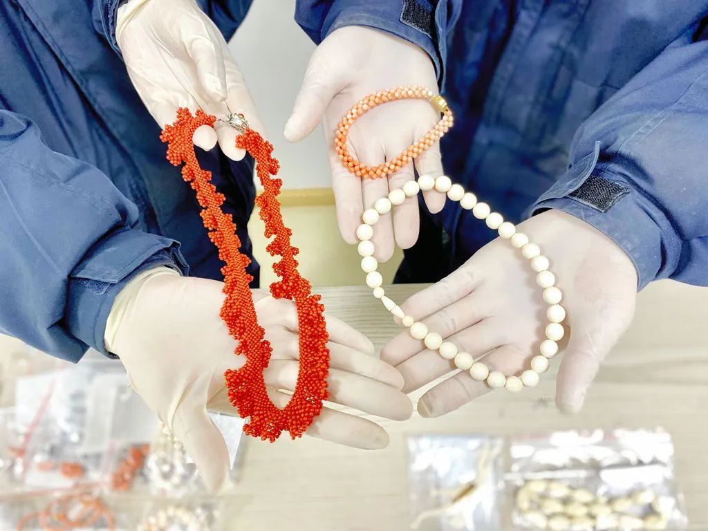 近日,杭州海关所属钱江海关关员在对进境邮件进行机检查验时,发现一个邮件的过机图像存在异常,部分区域具有象牙制品特有的成像特点。经现场开拆,发现该邮件内部分饰品呈现乳白色且具有十字交叉纹路,属于象牙制品特有的“利兹纹”。此外,邮件内其余一批饰品上带有纹路细密的生长纹,还能见到细小的虫蛀孔,属于红珊瑚制品的特点。