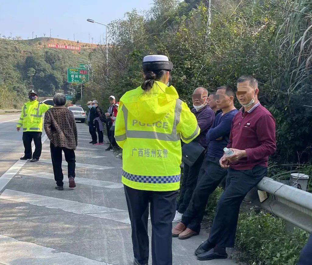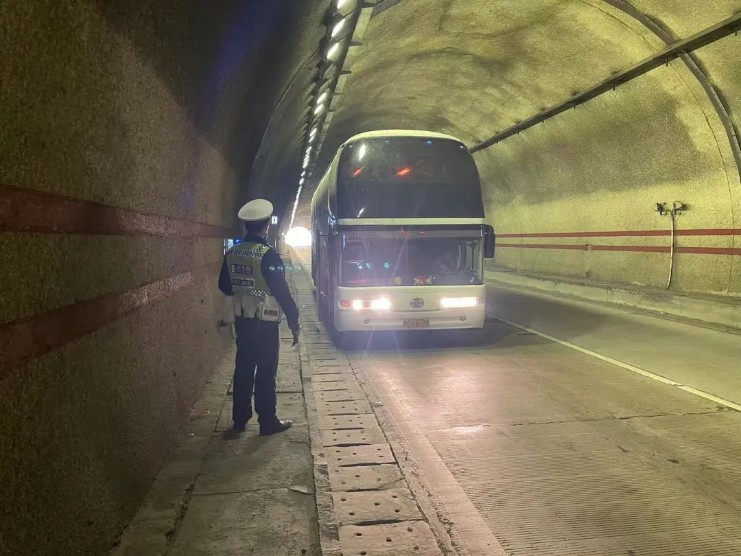 2月28日下午,梧州市公安局交警支队民警、辅警在包茂高速梧州段开展巡逻管控工作。14时40分左右,民警、辅警巡逻至倒水镇包茂高速公路隧道时,发现一辆旅游客车停在隧道里面无法移动。