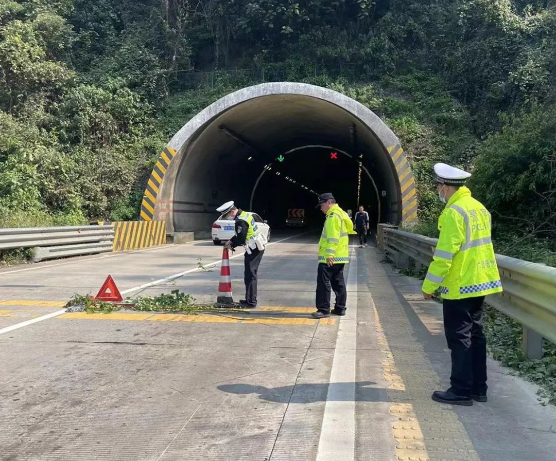 面对如此紧急情况,为避免事故发生,民警立即启动隧道故障车辆应急处置预案,将警车停在客车后边,下车摆放安全反光锥桶做好安全防护民警及时拉响警笛,提醒后方司乘人员注意前方路况,减速慢行。
