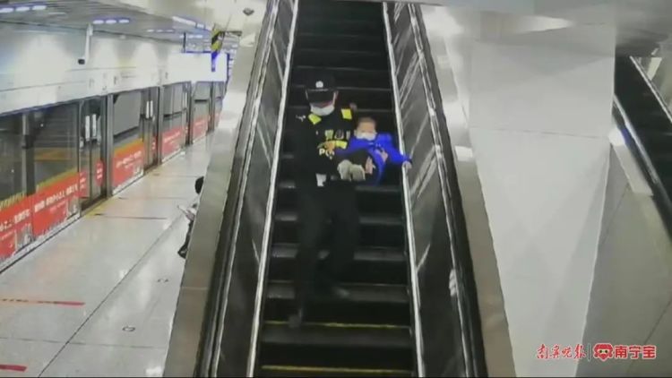 3月4日8时许,南宁市公安局地铁分局辅警何家进在地铁5号线虎邱站A端安检口开展安检督导工作时,忽然听见身后传来异常声响,工作的本能让何家进迅速顺着声响来源处查看情况。当他看见一名女士与一名小孩摔倒在自动手扶梯上时,飞身一跃翻过栏杆,跑上前按下手扶梯上的紧停按钮,避免因手扶梯运行对女士和小孩造成二次伤害。