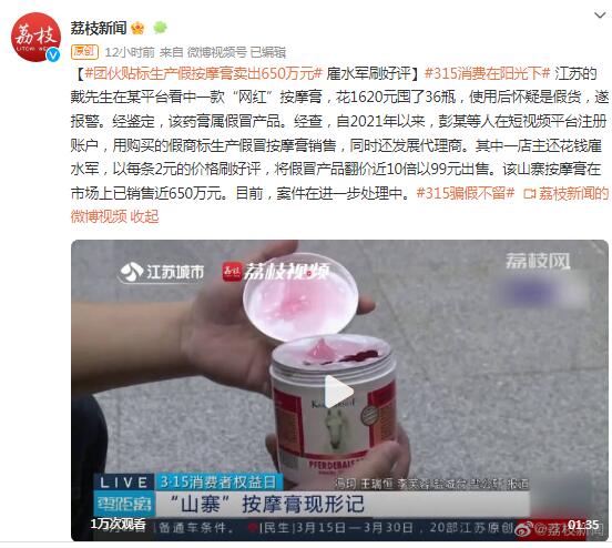 江苏的戴先生在某平台看中一款“网红”按摩膏,花1620元囤了36瓶,使用后怀疑是假货,遂报警。经鉴定,该药膏属假冒产品。经查,自2021年以来,彭某等人在短视频平台注册账户,用购买的假商标生产假冒按摩膏销售,同时还发展代理商。其中一店主还花钱雇水军,以每条2元的价格刷好评,将假冒产品翻价近10倍以99元出售。该山寨按摩膏在市场上已销售近650万元。目前,案件在进一步处理中。