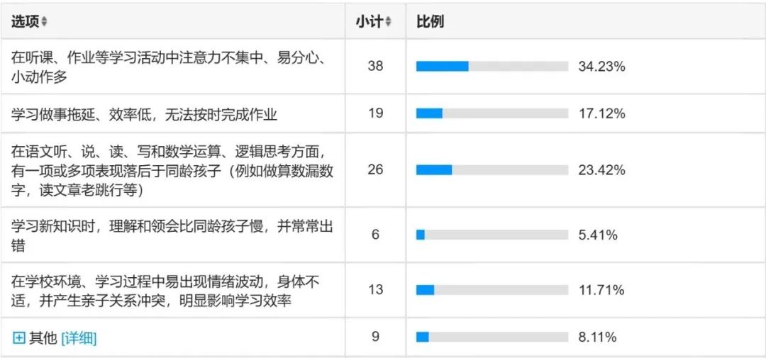 在“‘学习困难’的孩子最可能具有的特征”这项调查中,34%的家长将票投给“听课、写作业等学习活动中注意力不集中、易分心、小动作多”,23%的家长选择“在语文听说读写和数学运算、逻辑思考方面,有一项或多项表现落后于同龄孩子”。